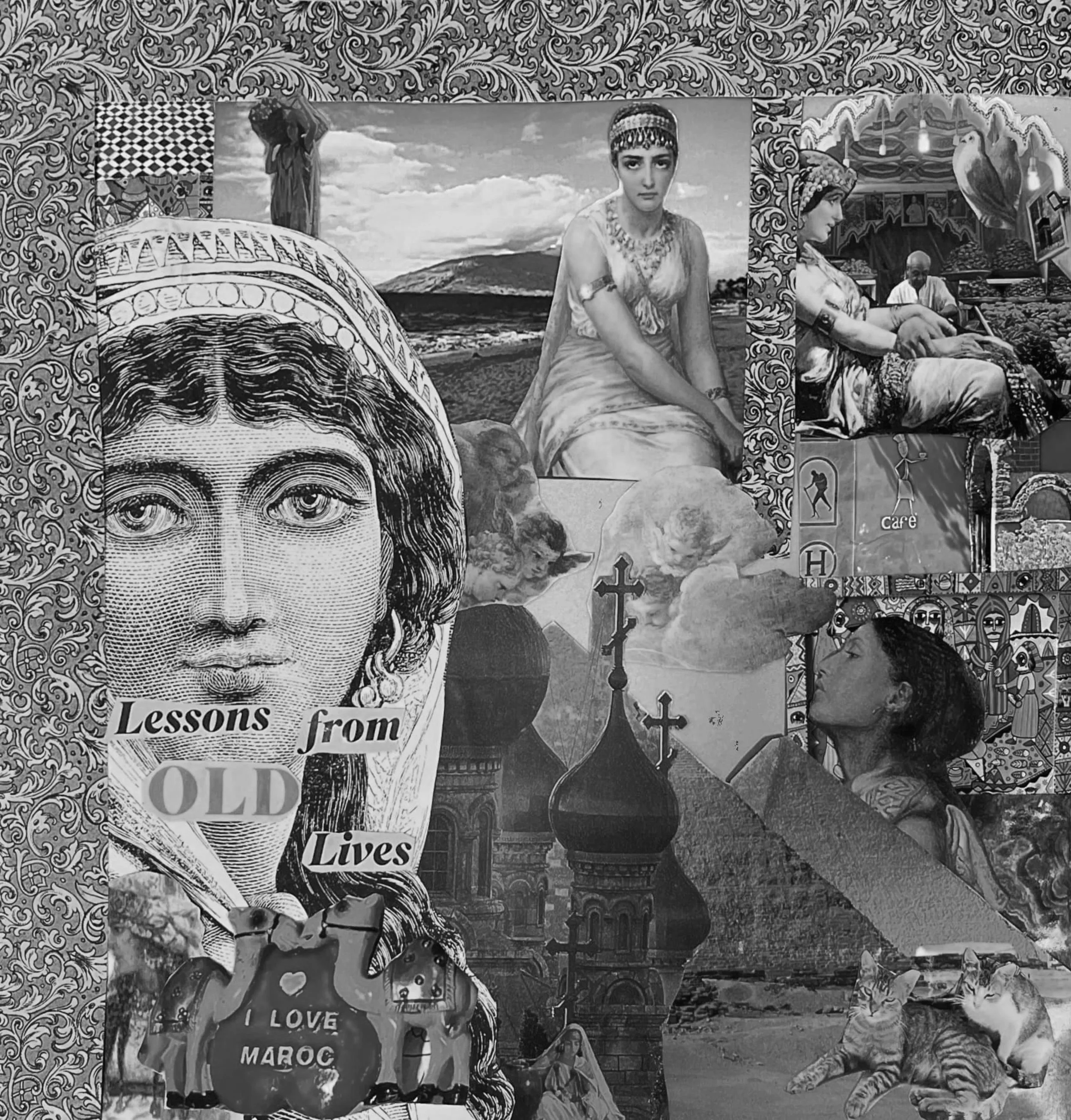 In “Lessons From Old Lives” and “Lavish Hospitality,” collage becomes a language of memory. Layered imagery draws from MENA culture to evoke diaspora, belonging, and the quiet power of human connection.